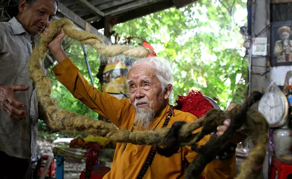 لم يلمسه حتى بالمشط منذ 80 عاماً ..فيتنامى يتفاخر بضفائرة تجاوزت 5 امتار