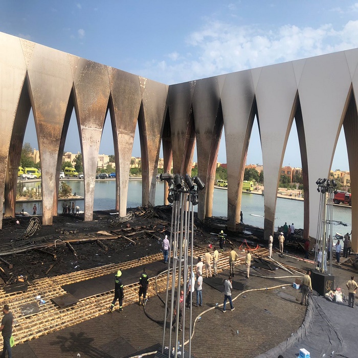 عاجل الصور الأولية لحريق مسرح مهرجان الجونة السينمائى أثناء تجهيزه بالغردقة
