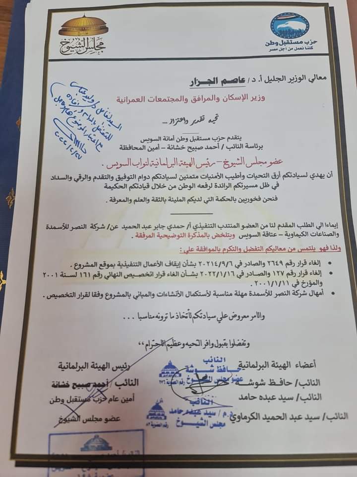 نواب مستقبل وطن بالسويس يشكرون وزارة الإسكان لإلغاء قرار إلغاء التخصيص لأرض النصر للأسمدة