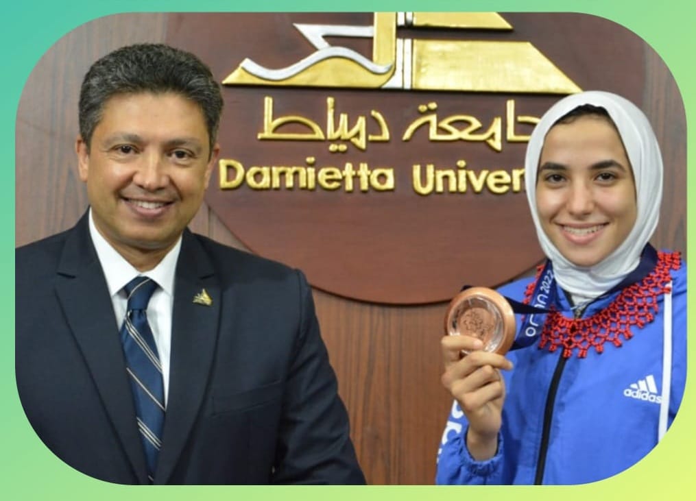 رئيس جامعة دمياط يكرم الطالبة يمنى عياد الحاصلة على الميدالية البرونزية في بطولة المتوسط