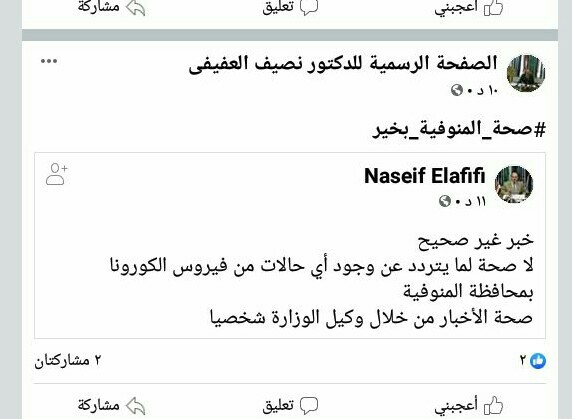 صحة المنوفية تنفى وجود اشتباه اصابة بفيروس كورونا فى اشمون