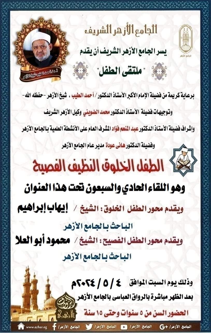 ملتقى الطفل الخلوق الفصيح بالجامع الأزهر الشريف غدآ