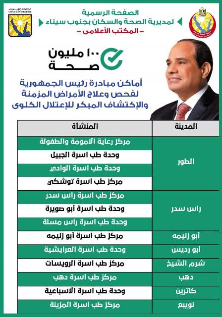 تعرف علي أماكن تنفيذ مبادرة رئيس الجمهورية لفحص وعلاج الامراض المزمنة والاكتشاف المبكر للأعتلال الكلوى بجنوب سيناء