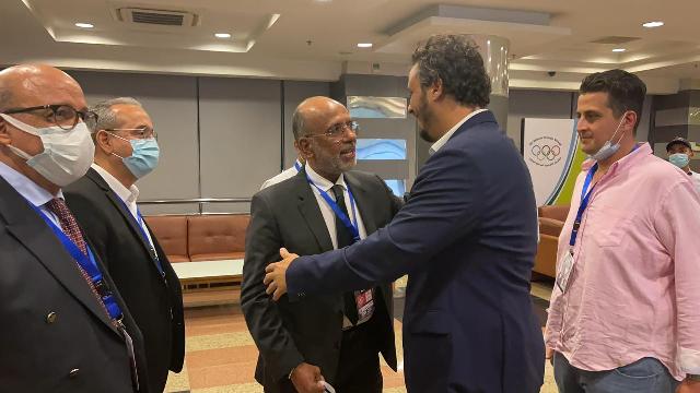 مسئولو بيراميدز فى استقبال رئيس نادى الرجاء المغربى يستاد الدفاع الجوى