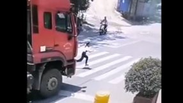 بالفيديو .. مغامر ينقذ فتاة من الدهس اسفل عجلات شاحنة