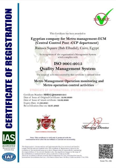 النقل: حصول الشركة المصرية لإدارة وتشغيل مترو الأنفاق على شهادة " 9001 ISO "