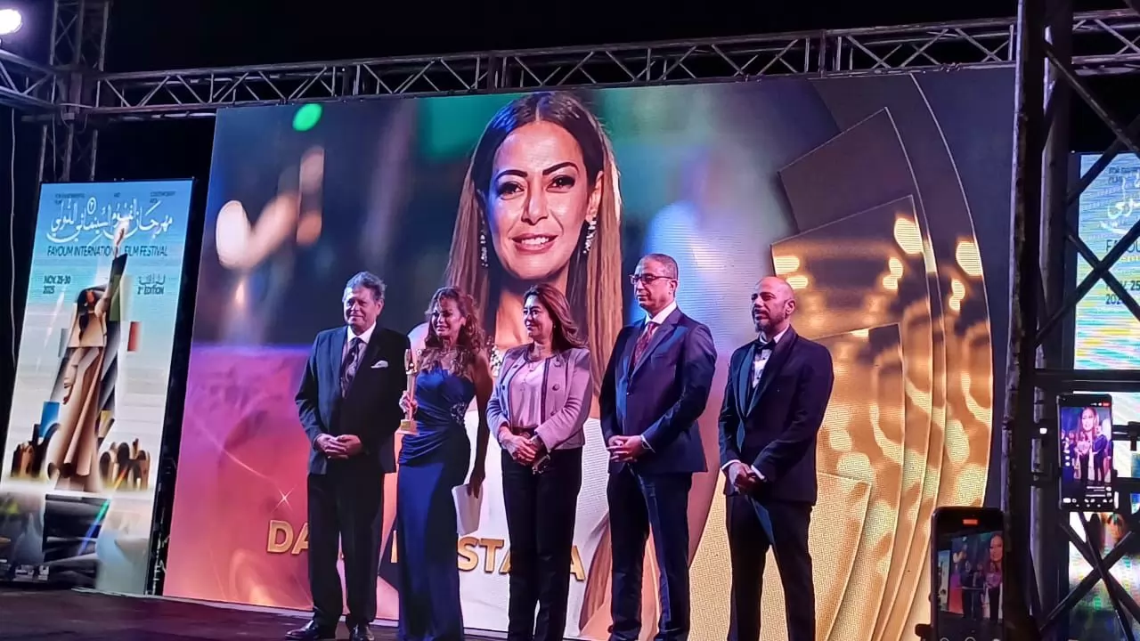 تصفيق حار للفنانة داليا مصطفى اثناء تكريمها بمهرجان الفيوم لسينما البيئة