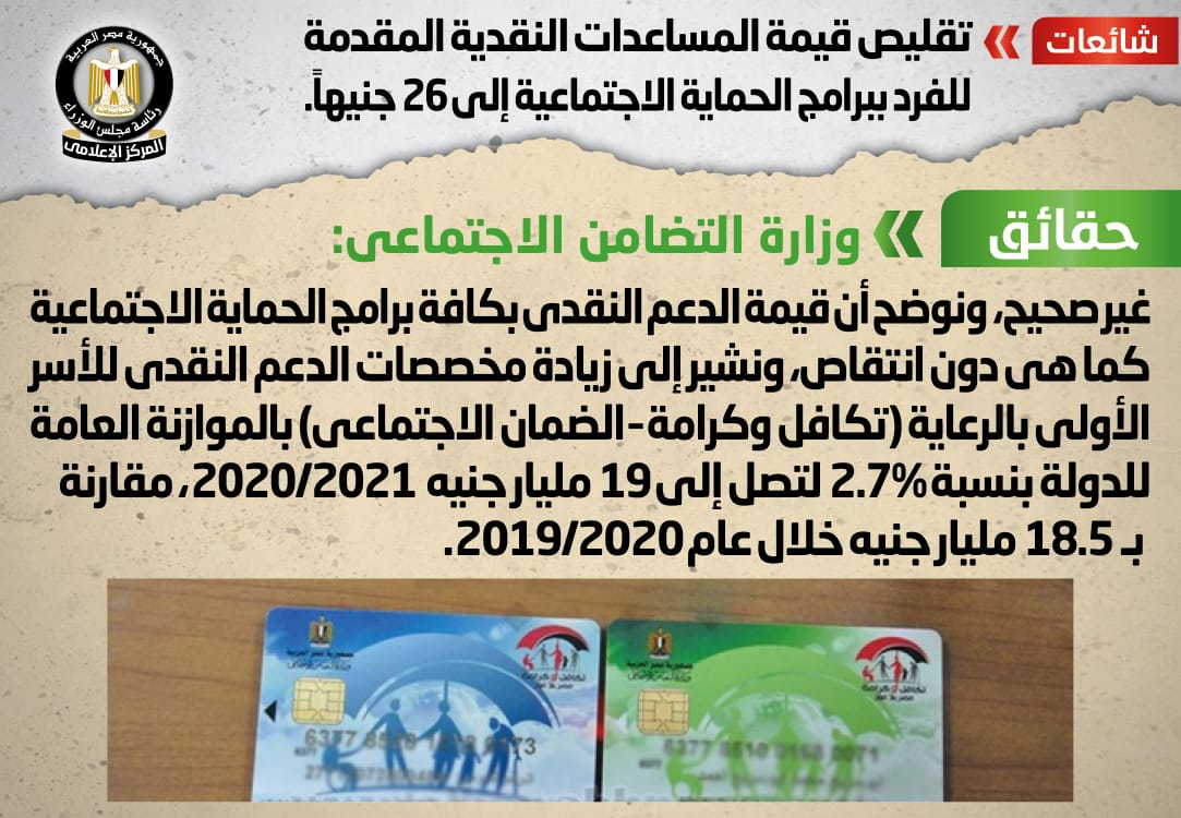 تقليص قيمة المساعدات النقدية المقدمة للفرد ببرامج الحماية الاجتماعية لـ26 جنيهًا.. "شائعة"