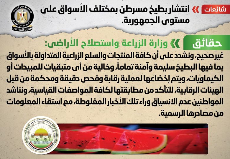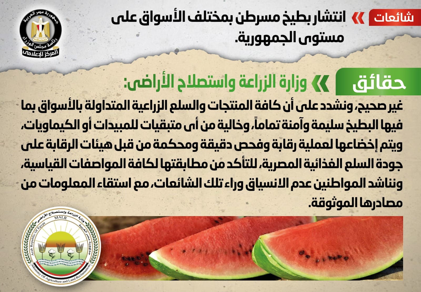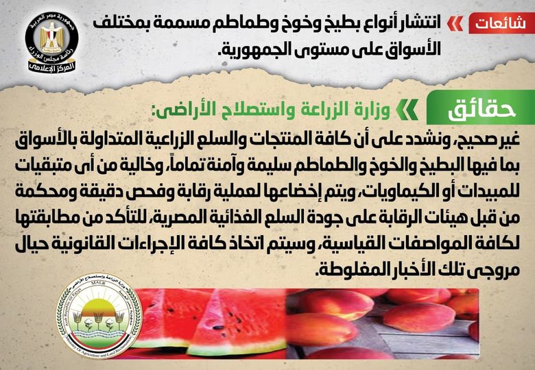 الحكومة توضح حقيقة انتشار أنواع بطيخ وخوخ وطماطم مسممة بمختلف الأسواق