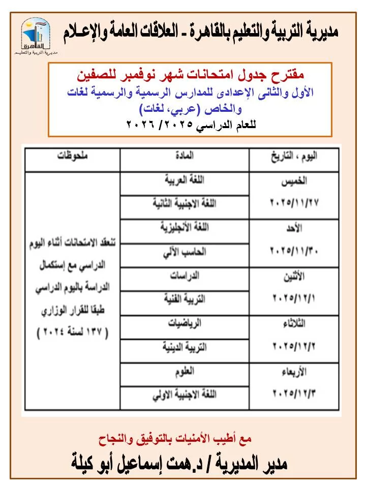 محافظ القاهرة يعتمد جداول إمتحانات الدور الثاني ٢٠٢٥/٢٠٢٤