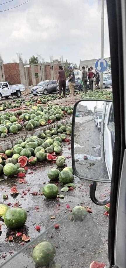 انقلاب سيارة نقل محملة بالبطيخ علي طريق جمصه