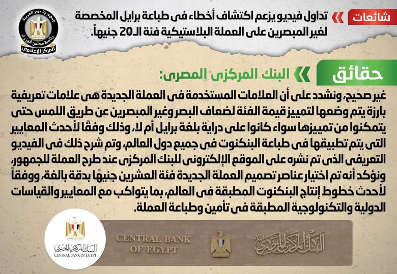 الحكومة تنفي وجود أخطاء في طباعة فئة العشرين جنيه