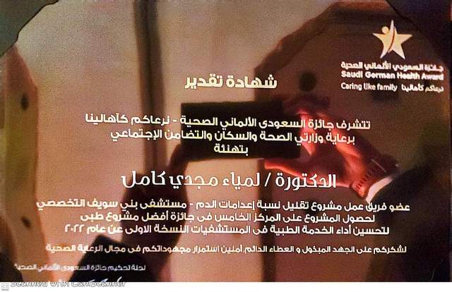 بنى سويف التخصصى الخامس فى جائزة أفضل مشروع طبى .
