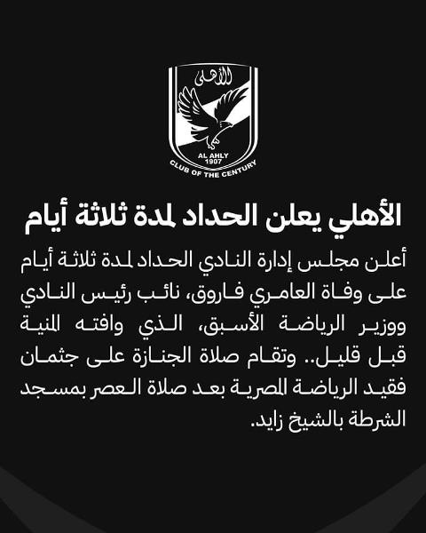 وقف بث قناة الاهلى 3 أيام حدادا على وفاة العامرى فاروق
