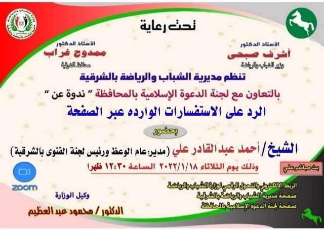 ندوة تثقيفية بعنوان الرد علي الإستفسارات الواردة عبر صفحة مديرية الشباب والرياضة بالشرقية أون لاين