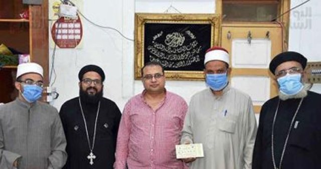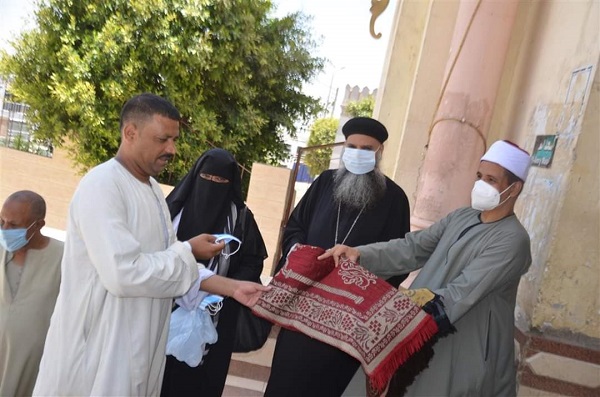 وكيل مطرانية إسنا يوزع كمامات ومصليات أمام مسجد العتيق