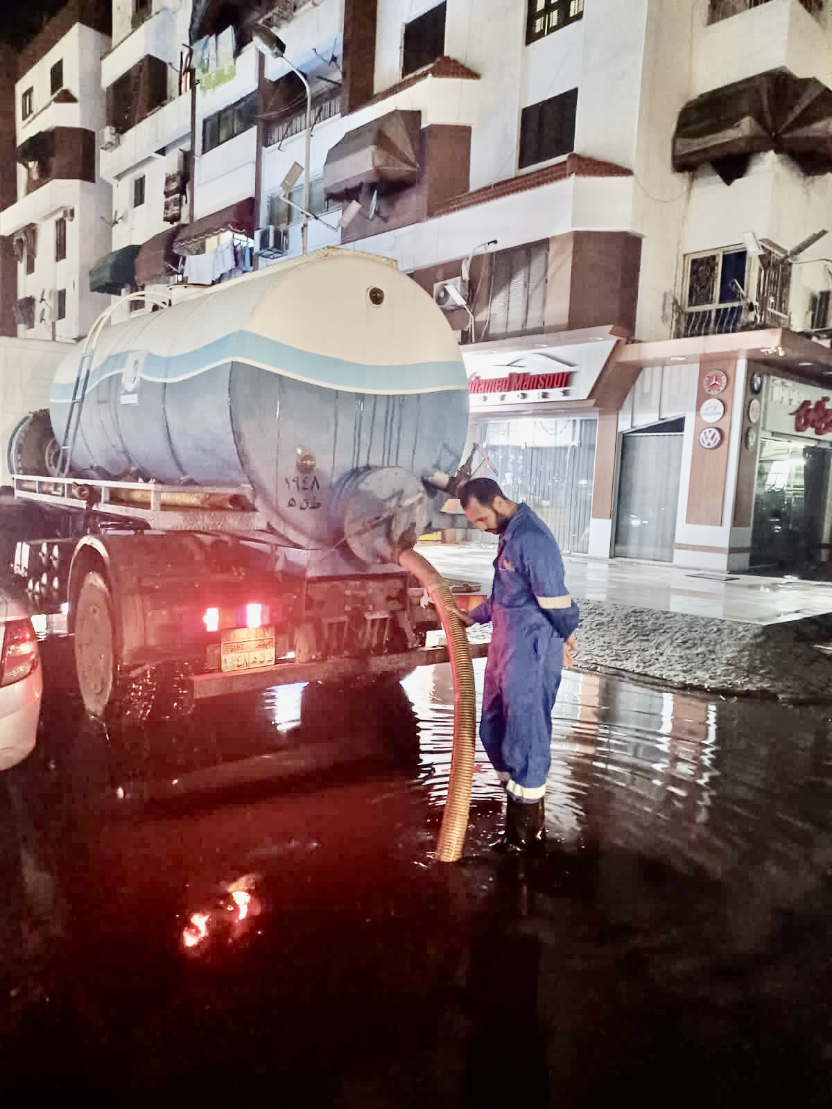 مياه البحر الاحمر تدفع بسياراتها ومعداتها لسحب مياه الأمطار