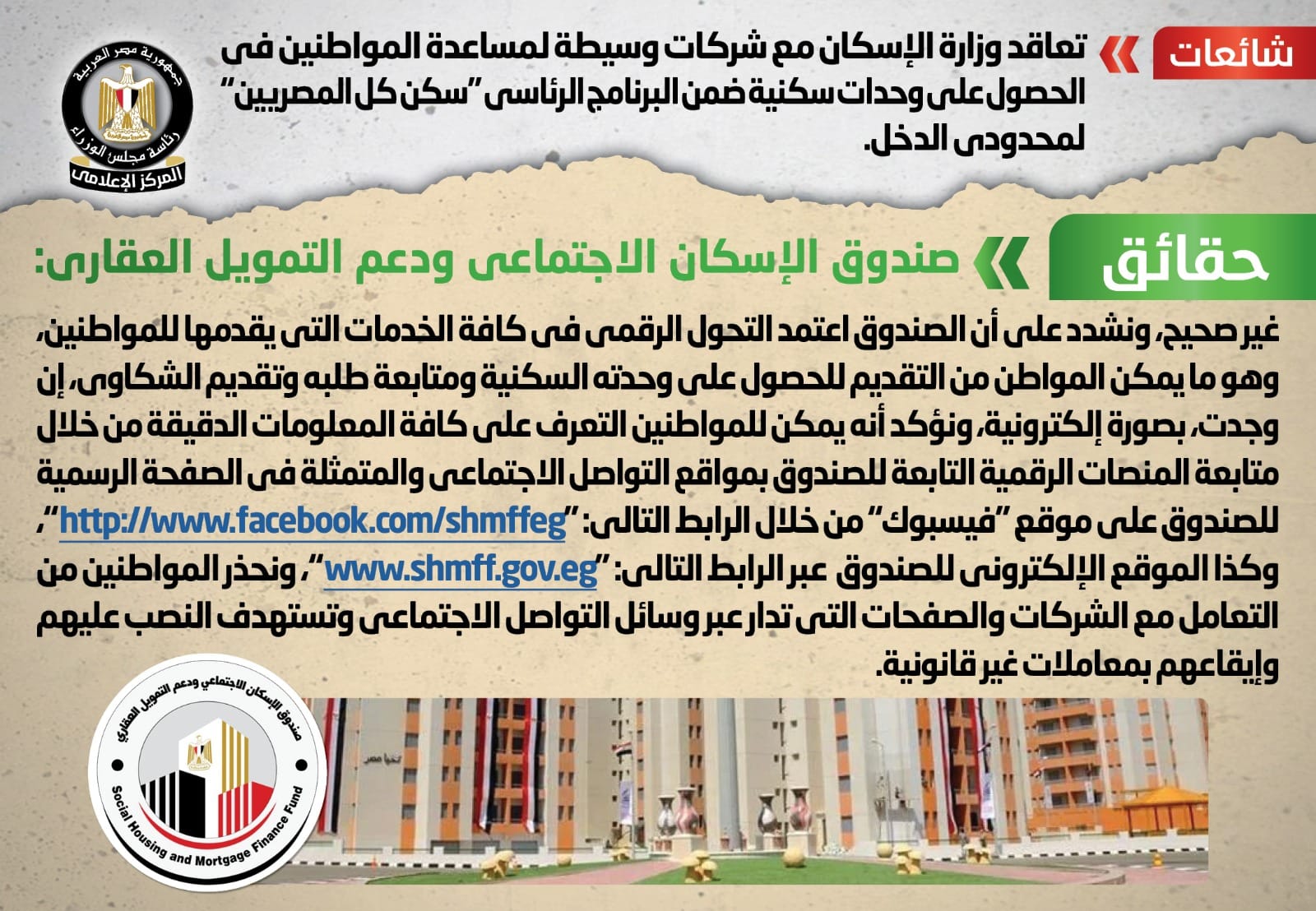 الحكومة تنفي تعاقدالإسكان مع شركات وسيطة لبيع وحدات سكن كل المصريين