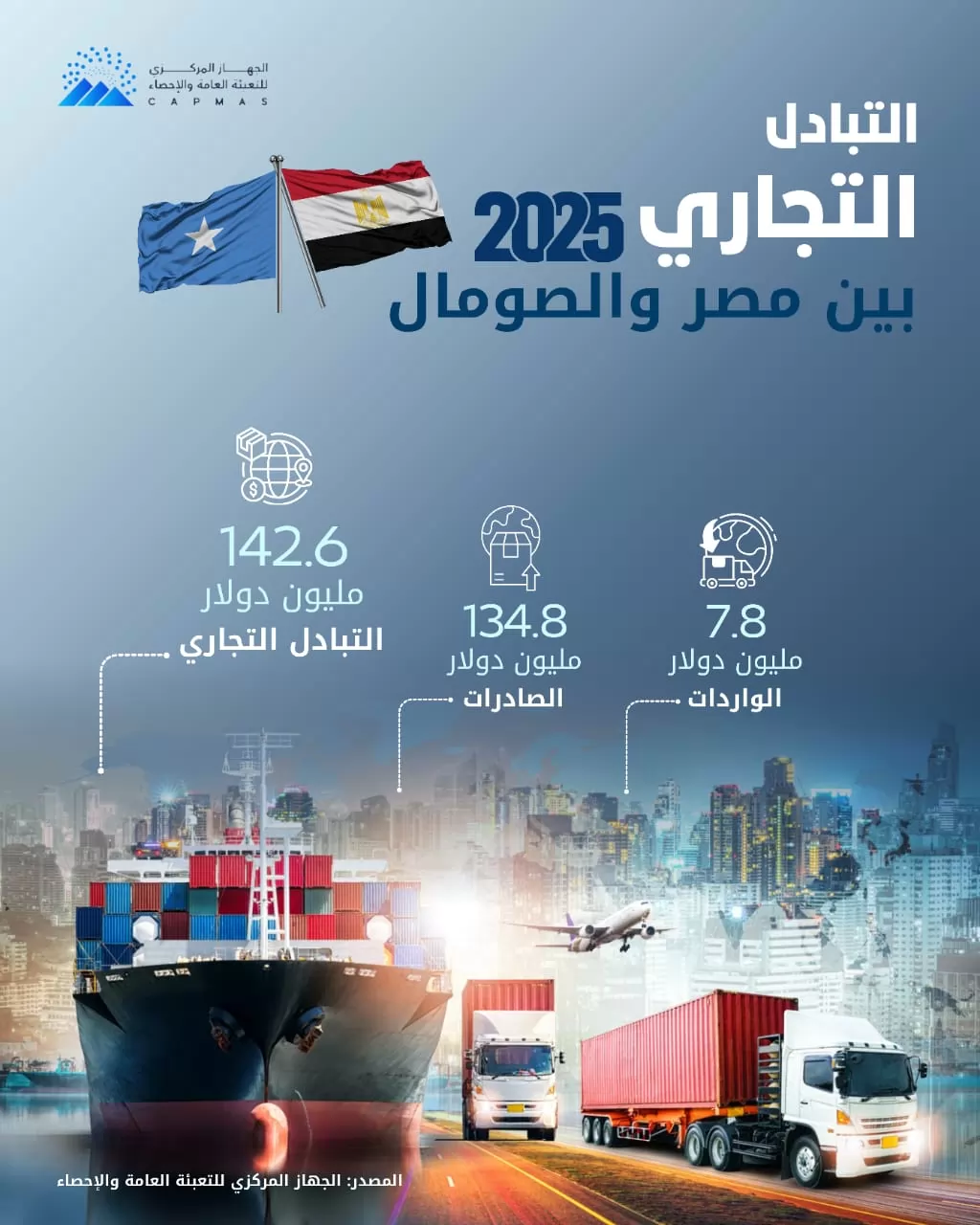 الإحصاء : 11.6 % ارتفاعًا في حجم التبادل التجارى بين مصر والصومال خلال عام 2025