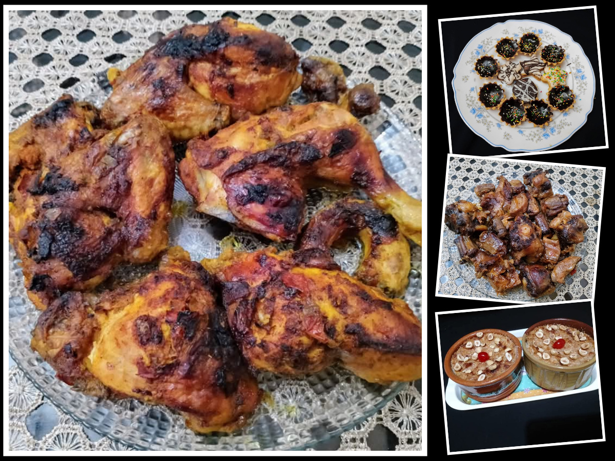 الافطار: أجنحة دجاج بدبس الرمان وأقراص اللحم والحلو: بودينج الشوكولاتة