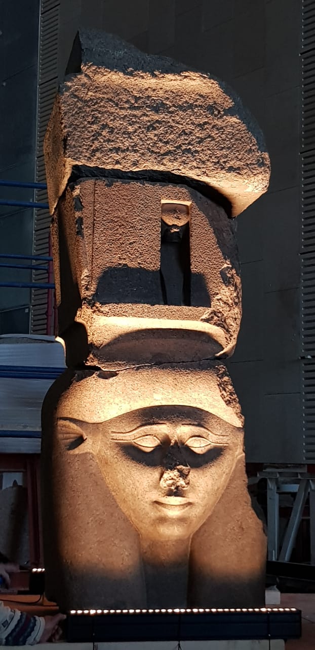 تثبيت وإضاءة القطع الأثرية الثقيلة علي الدرج العظيم بالمتحف المصري الكبير