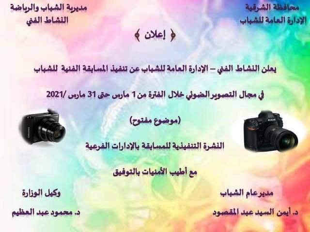 "الشباب والرياضة" تُعلن عن تنظيم مسابقة فنية في مجال التصوير الضوئي لأعضاء مراكز الشباب