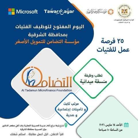 الأحد 14 مارس الجاري.. الشباب والرياضة تنظم يومًا مفتوحًا لتوظيف 25 فتاة بمؤسسة التضامن للتمويل الأصغر بفرع مدينة الحسينية