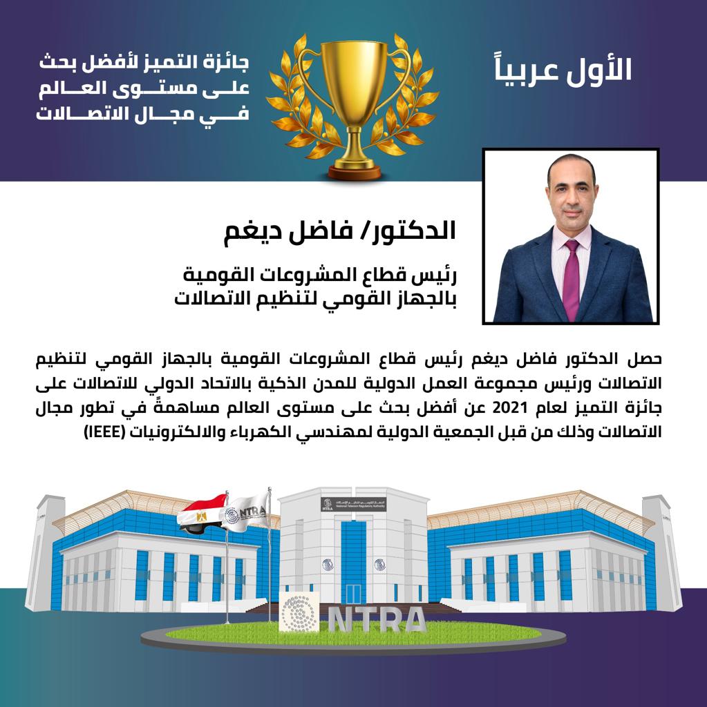 رئيس قطاع المشروعات القومية ب " تنظيم الاتصالات " يحصل على جائزة أفضل بحث على مستوى العالم