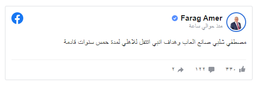 ونشر فرج عامر عبر صفحته على موقع التواصل الاجتماعى "فيس بوك" قائلا: "مصطفى شلبي صانع العاب وهداف إنبي انتقل للأهلي لمدة خمس سنوات قادمة ".