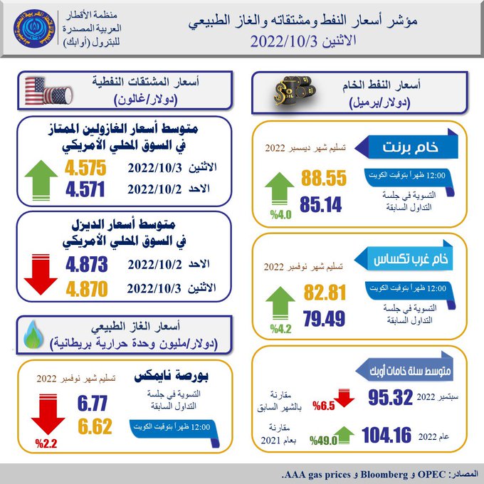نشرت منظمة الدول العربية المصدرة للبترول "أوابك"، اليوم الإثنين، على صفحتها الرسمية عبر أحد مواقع التواصل الاجتماعي "تويتر"، إنفوجرافا جديدا يسلط الضوء على مؤشرات أسعار النفط ومشتقاته وأسعار الغاز الطبيعى، حيث سجل خام برنت تسليم شهر ديسمبر 2022 نحو 88.55 دولار للبرميل، وخام غرب تكساس 82.81 دولار للبرميل.