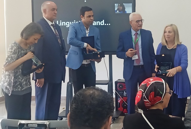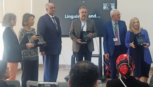كرم الدكتور حسين محمود، عميد كلية اللغات والترجمة بجامعة فى القاهرة "BUC"، ورئيس المؤتمر، عدد من رموز وعلماء مجال: "اللغات، الترجمة، والآداب" أثناء فاعليات مؤتمر "كلية اللغات والترجمة" بالجامعة فى دورته الثانية داخل الحرم الجامعى؛ نظير ما قدموه من إسهامات جليلة فى علوم "اللغات، الترجمة، والآداب"، ونتيجة مشاركتهم الفعالة خلال أيام المؤتمر، وكان التكريم بدعم من الدكتور حسن القلا رئيس مجلس أمناء الجامعة، ورعاية الدكتور فوزى تركى رئيس الجامعة، وإشراف الدكتور إبراهيم القلا نائب رئيس الجامعة لشئون التعليم والطلاب.