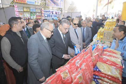 عقب الافتتاح تفقد المحافظ ومرافقوه أقسام المعرض التى تضم السلع الغذائية المتنوعة "اللحوم - السكر - الزيت - السمن - الأرز - المكرونة - الدقيق والحلويات بأنواعها" والتى يتم بيعها بأسعار مخفضة بالمقارنة بمثيلاتها فى الخارج.