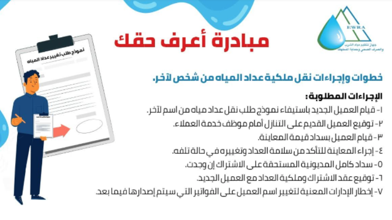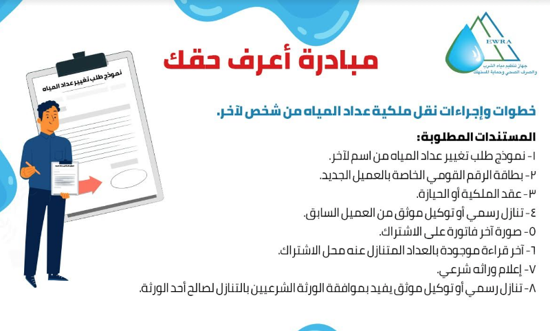 نشر الجهاز التنظيمي لمياه الشرب والصرف الصحى وحماية المستهلك، عبر موقعه الإلكتروني، وصفحته الرسمية على الفيس بوك، إنفوجرافا، يوضح للمواطنين، الخطوات والإجراءات والمستندات المطلوبة، في حالة نقل ملكية عداد المياه من شخص لآخر، وذلك في إطار مبادرة (اعرف حقك) التي أطلقها الجهاز التنظيمي، والتي تهدف إلى نشر بعض المعلومات الهامة لتعريف المواطنين بحقوقهم وواجباتهم.