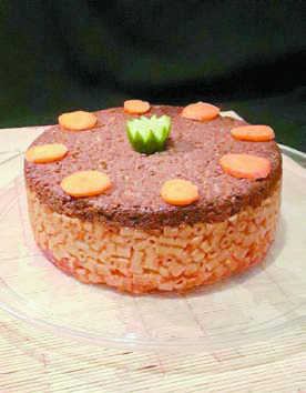 نضع العصاج فى الطاجن ونضغط عليه جيدا ثم نضع المكرونة ثم نضيف الصلصة الخفيفة ونحرك الطاجن حركة خفيفة ونغطيه بفويل ويدخل فرن ساخن على الرف فوق الأرضية لمدة نصف ساعة أو حتى تمام سوا المكرونة ثم يقلب على طبق التقديم ويزين.