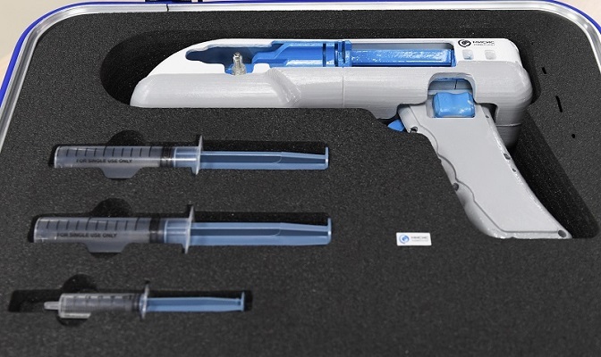 وأضاف "الجهاز قابل للاستخدام في حالات الإصابات الخفيفة والمتوسطة، قبل البدء باستخدامه يتم ملء محقنتين بسعة 20 ملم بالبوليمرات الحيوية والمستحضرات الطبية، ومحقن ثالث بعامل تشبيك خاص لهذه المواد، وعند الضغط على الزناد يقوم نظام من الموجات فوق الصوتية بتجميع المكونات، فتتشكل لدينا مادة بوليميرية يمكن أن توقف النزيف وتسرع عملية تجديد الأنسجة.. وتشير الدراسات التي أجريت على الحيوانات المخبرية إلى أن استخدام هيدروجيل مكون من عنصرين يسرع التئام الجروح والحروق".