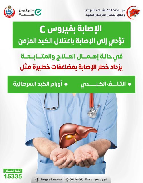 أشارت وزارة الصحة والسكان المصرية: ننصحك بالكشف المبكر والمتابعة والعلاج ضمن مبادرة رئيس الجمهورية للاكتشاف المبكر وعلاج مرضى سرطان الكبد.