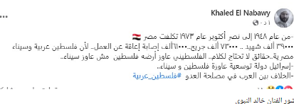 وكتب خالد النبوي عبر حسابه الشخصى على الفيسبوك قائلا: من عام 1948 إلى نصر أكتوبر عام 1973 تكلفت مصر 39000 ألف شهيد و73000 ألف جريح و61000 ألف إصابة إعاقة عن العمل.