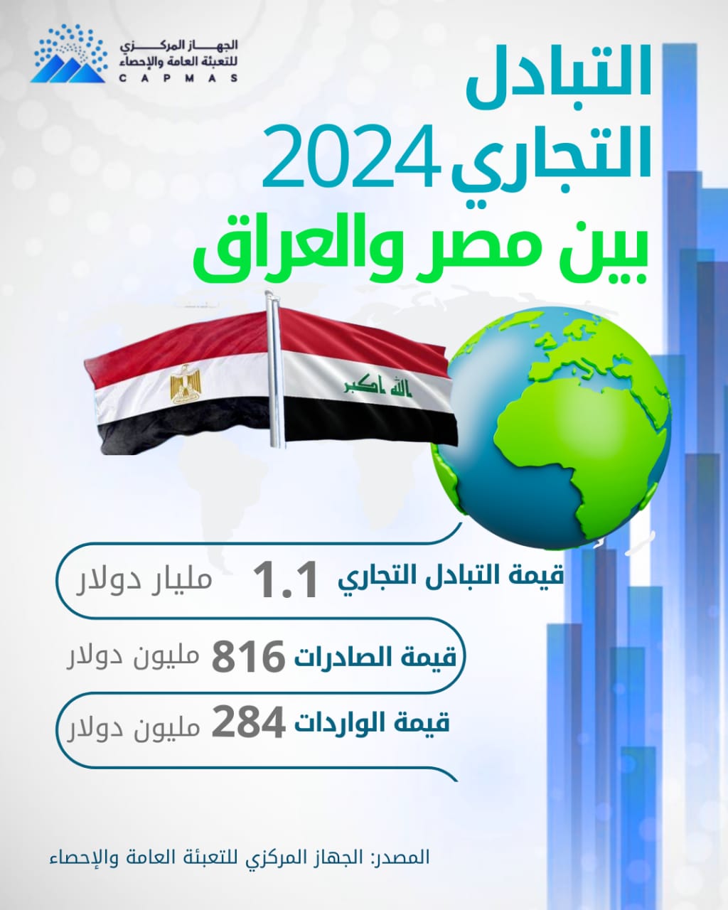 كما كشفت بيانات الجهاز عن ارتفاع قيمة التبادل التجاري بين مصر والعراق لتصل إلى 1.1 مليار دولار خلال عام 2024 مقابل 872 مليون دولار خلال عام 2023 بنسبة ارتفاع قدرها 26.1 %.