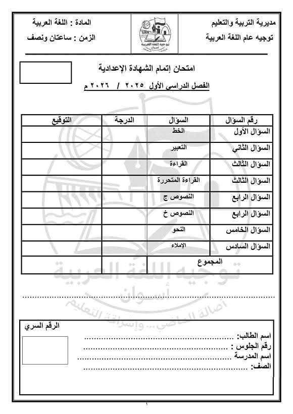 تواصل بوابة الجمهورية، تقديم خدماتها لطلاب وطالبات الشهادة الاعدادية على مستوى جمهورية مصر العربية، من خلال نشر النموذج الأول في مادة اللغة العربية، بمحافظة أسوان، والتي سوف يؤدي فيها الطلاب امتحان الفصل الدراسي الأول بعد غد السبت، الموافق 17 يناير 2026.