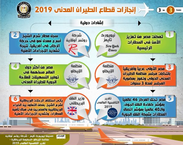 وأبرز الإنفوجراف عدداً من الإشادات الدولية الواسعة بقطاع الطيران المدني في مصر من قبل العديد من الشركات العالمية، حيث أشارت “نيويورك تايمز” إلى أن مصر تمكنت من تعزيز الأمن في المطارات الرئيسية.