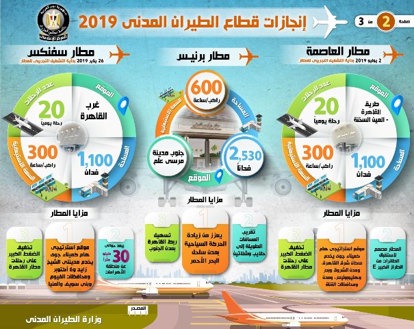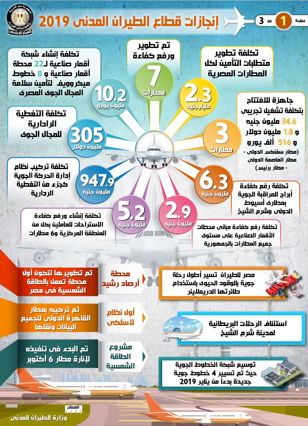 وفي هذا الشأن، نشر المركز الإعلامي لمجلس الوزراء، إنفوجرافاً سلط من خلاله الضوء على حصاد قطاع الطيران المدني على مدار عام 2019.
