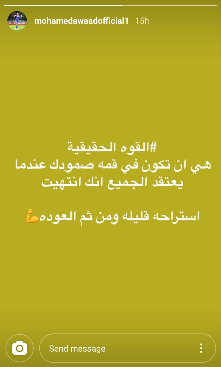 ونشر عبر حسابه الشخصى على موقع انستجرام "القوة الحقيقية هي أن تكون في قمة صمودك عندما يعتقد الجميع أنك انتهيت ..استراحة محارب ومن ثم العودة".