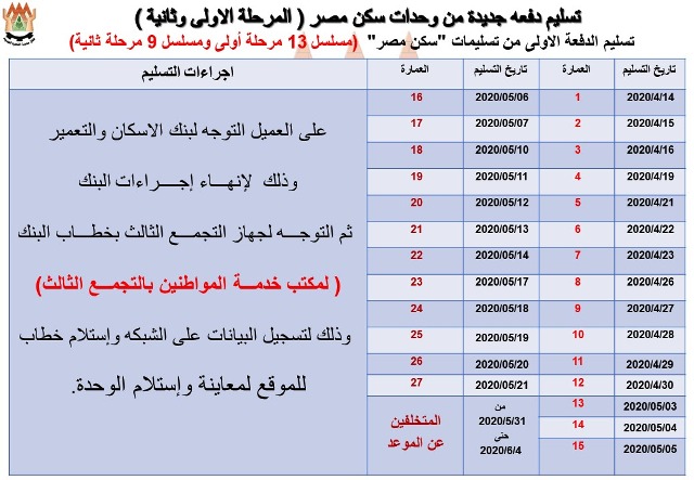 الجدير بالذكر أن العمارات التى سيتم تسليم الوحدات جاءت أرقامها ومواعيد تسليمها كالتالى: