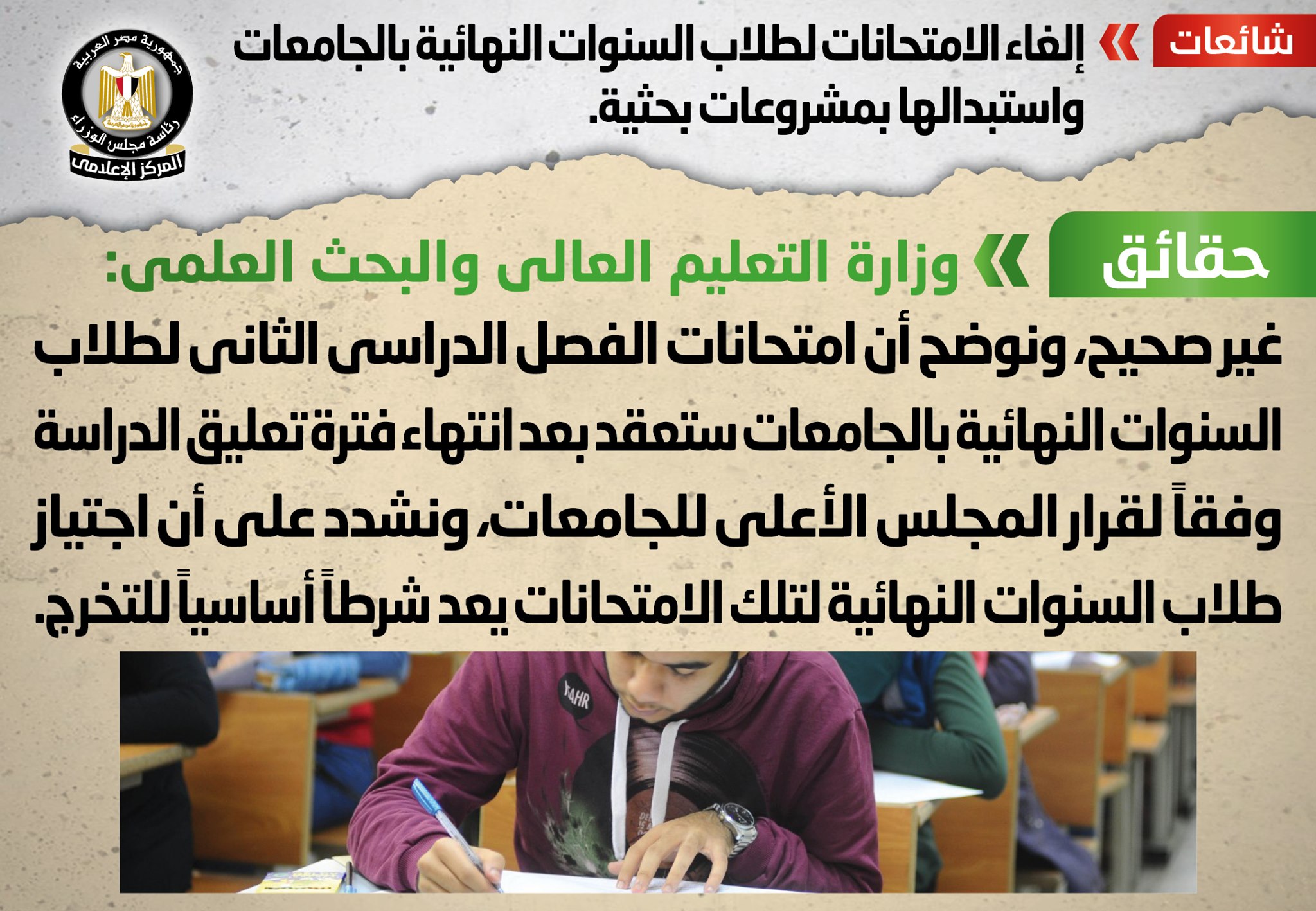 وقد قام المركز الإعلامي لمجلس الوزراء بالتواصل مع وزارة التعليم العالي والبحث العلمي، والتي نفت تلك الأنباء، مؤكدةً أنه لا صحة لإلغاء الامتحانات لطلاب السنوات النهائية بالجامعات واستبدالها بمشروعات بحثية، مُوضحةً أن امتحانات الفصل الدراسي الثاني لطلاب السنوات النهائية بالجامعات ستعقد بعد انتهاء فترة تعليق الدراسة وفقاً لقرار المجلس الأعلى للجامعات، مشددةً على أن اجتياز طلاب السنوات النهائية لتلك الامتحانات يعد شرطاً أساسياً للتخرج، وذلك في إطار حرص الدولة على مستقبل أبنائها من طلاب الجامعات.