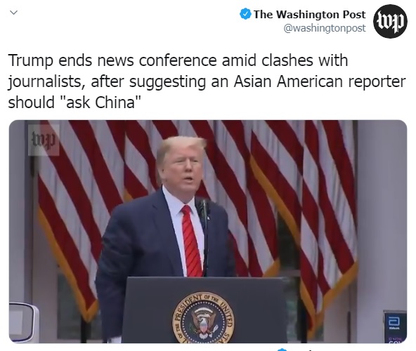 وبعد ذلك سئل ترامب عن سبب استمراره في الحديث عن عدد الاختبارات في ما يتعلق بكورونا في الولايات المتحدة، بينما تستمر الوفيات، فرد بحدة: "لا تسألوني.. اسألوا الصين"، ووصف الرئيس الأمريكي السؤال بـ"القبيح" ما أثار غضب الصحفية التي وجهت له السؤال.