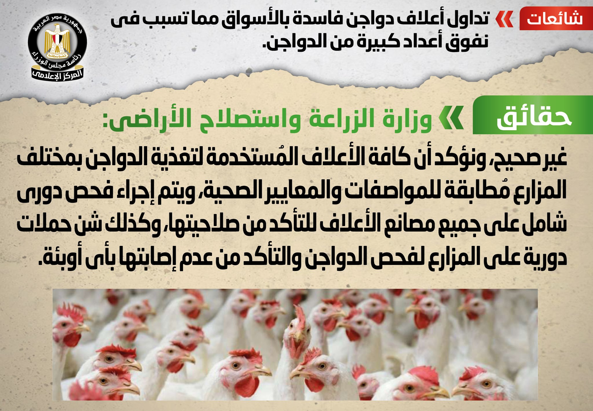 وقد قام المركز الإعلامي لمجلس الوزراء بالتواصل مع وزارة الزراعة واستصلاح الأراضي، والتي نفت تلك الأنباء، مُؤكدةً أنه لا صحة لتداول أعلاف دواجن فاسدة بالأسواق، وأن كافة الأعلاف المُستخدمة لتغذية الدواجن بمختلف المزارع مُطابقة للمواصفات والمعايير الصحية، مُوضحةً أنه يتم إجراء فحص دوري شامل على جميع مصانع الأعلاف للتأكد من صلاحيتها، وكذلك شن حملات دورية متعاقبة على المزارع لفحص الدواجن والتأكد من عدم إصابتها بأي أوبئة.