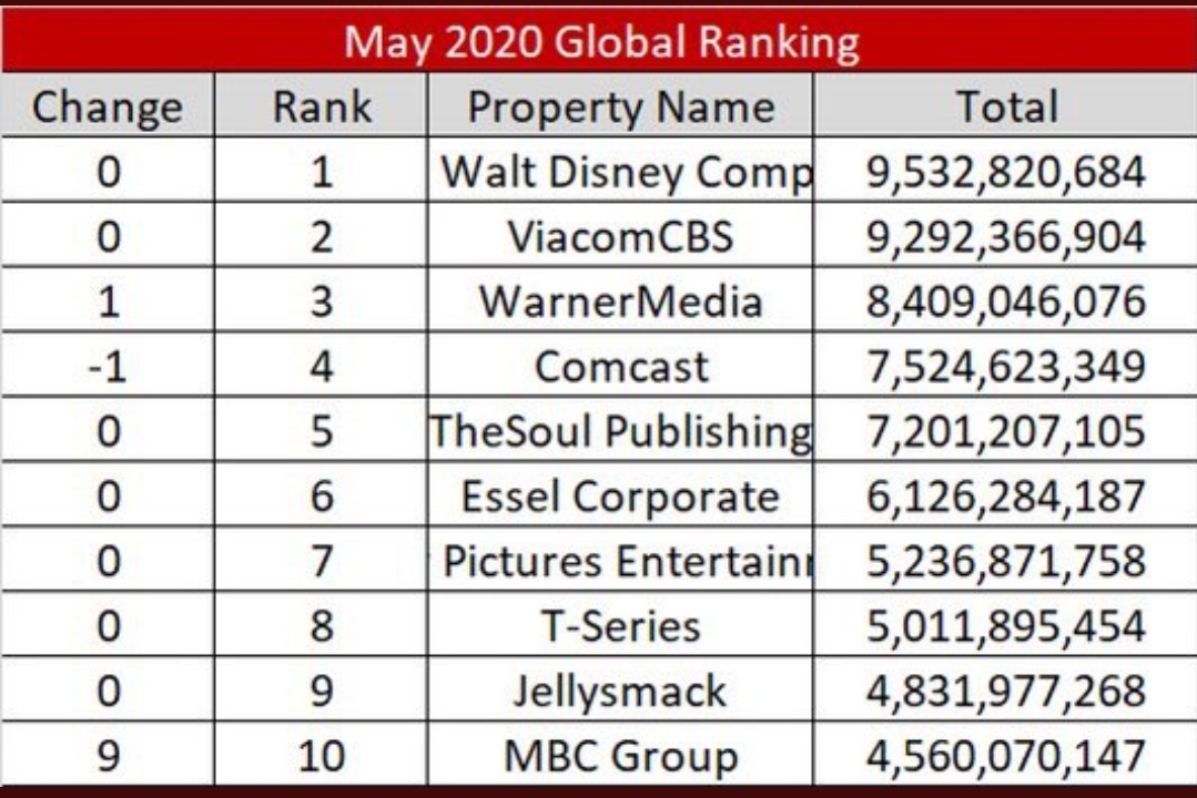 1) The Walt Disney Company، 2) ViacomCBS، 3) WarnerMedia، 4) Comcast، 5) TheSoul Publishing، 6، Essel Corporate، 7) Sony Pictures Entertainment، 8) T- Series، 9) Jellysmack، 10) MBC Group.