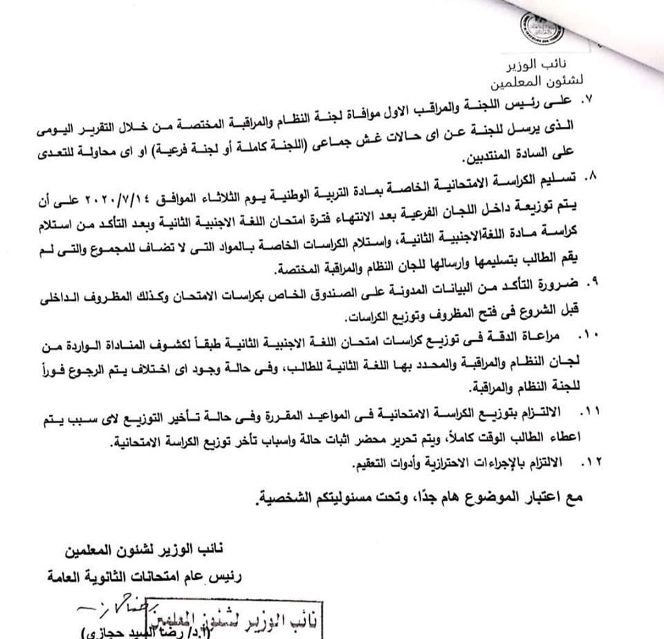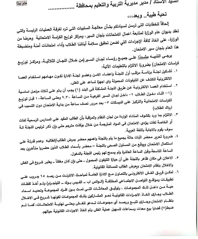 عقد اجتماع مع جميع المسئولين عن اللجان والمديريات والادارات التعليمية لفضح الممارسات الخاطئة التي كشفت عنها الامتحانات الماضية من وجود فوضي في بعض اللجان والسماح بالغش ودخول الطلاب بالموبايلات واتخاذ مواقف حازمة وحاسمة تجاه اي تجاوز يشكو منه الطلاب الملتزمون واولياء الامور.
