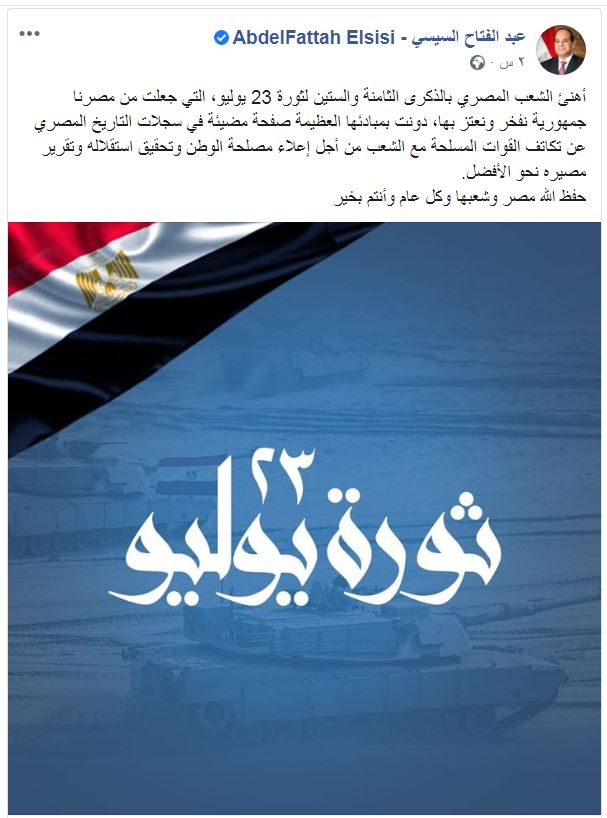 هنأ الرئيس عبد الفتاح السيسي الشعب المصري عبر شبكه التواصل الاجتماغي بالذكري ٦٨ لثوره ٢٣ يوليو ، وقال عبر حساب سيادته الرسمي " ثوره ٢٣ يوليو التي جعلت من مصرنا جمهوريه نفخر ونعتز بها دونت بمبادئها العظيمه صفحه مضيئه في سجلات الناريخ المصري عن تكاتف القوات المسلحه مع الشعب من أجل إعلاء مصاحه الوطن وتحقيق استقلاله وتقرير مصيره نحو الافضل