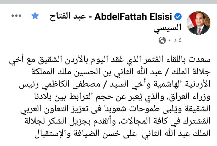 كتب الرئيس : "سعدت باللقاء المُثمر الذي عُقد اليوم بالأردن الشقيق مع أخي جلالة الملك / عبد الله الثاني بن الحسين ملك المملكة الأردنية الهاشمية وأخي السيد / مصطفى الكاظمي رئيس وزراء العراق، والذي يُعبر عن حجم الترابط بين بلادنا الشقيقة ويُلبى طموحات شعوبنا فى تعزيز التعاون العربي المُشترك في كافة المجالات، وأتقدم بجزيل الشكر لجلالة الملك عبد الله الثاني على حُسن الضيافة والإستقبال"